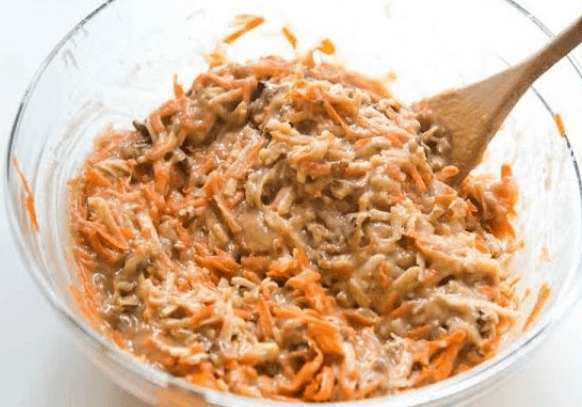 Поступово додайте суху суміш до збитих яєць, обережно перемішуючи на найнижчій швидкості міксера. Потім додайте натерту моркву й акуратно перемішайте тісто.