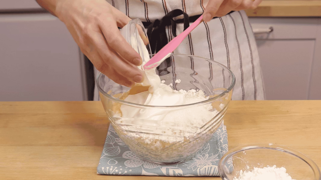 Висипати половину сухих інгредієнтів у миску і перемішати.