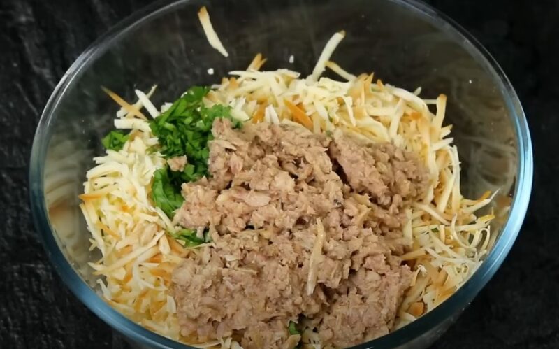5. Додайте нарізану зелень до яєць із сиром, а також тунець і чорний перець. Все ретельно перемішайте.