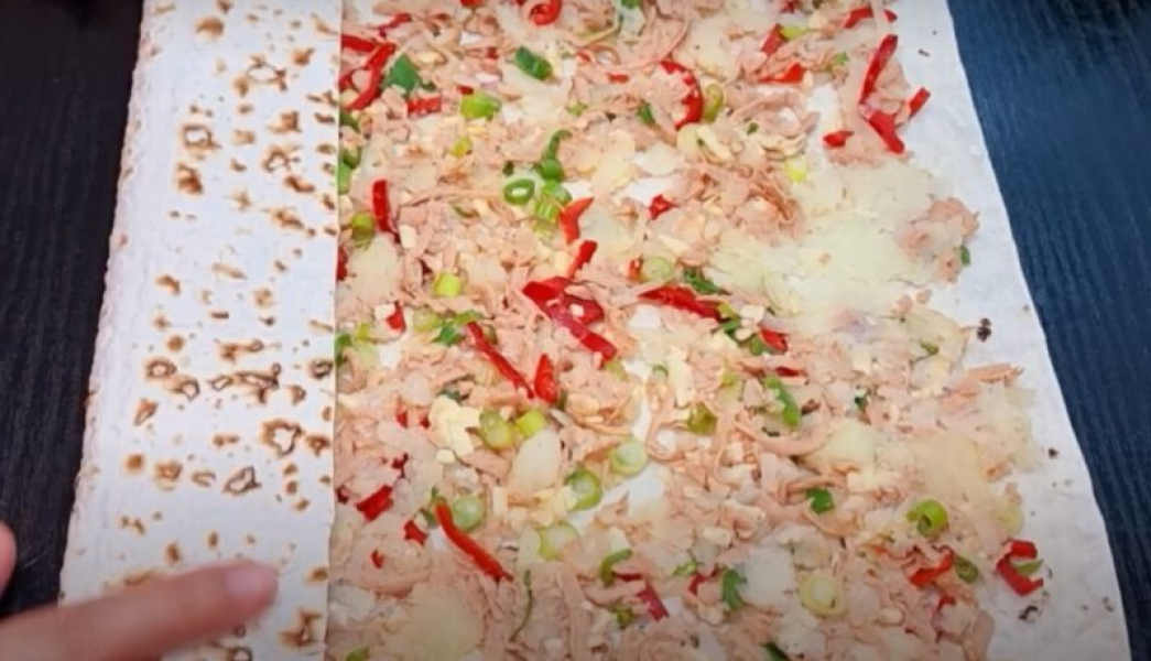 3. Викладіть приготовану начинку на лист лаваша та обережно загорніть у рулет.