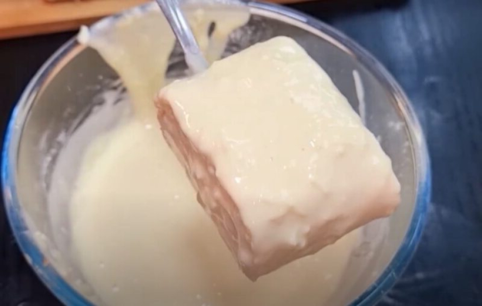 5. В окремій мисці збийте яйця зі сметаною, натріть залишок сиру і додайте сіль. Поступово насипте борошно та перемішайте. Занурте шматочки лаваша в отриману масу.