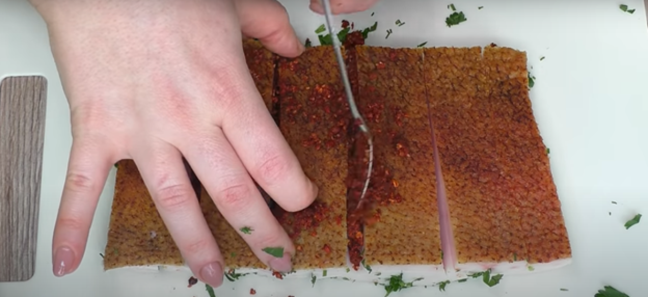 6. Тепер сало готове! Наріжте його на порції та насолоджуйтесь смачною закускою. Не забудьте струсити зайву сіль і поділитися з близькими.