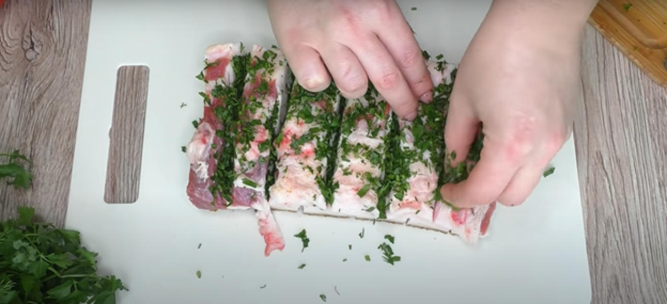 2. На наступному етапі наріжте дрібно зелень — кріп і петрушку. Заповніть ними надрізи, зосередившись на м’ясній частині.